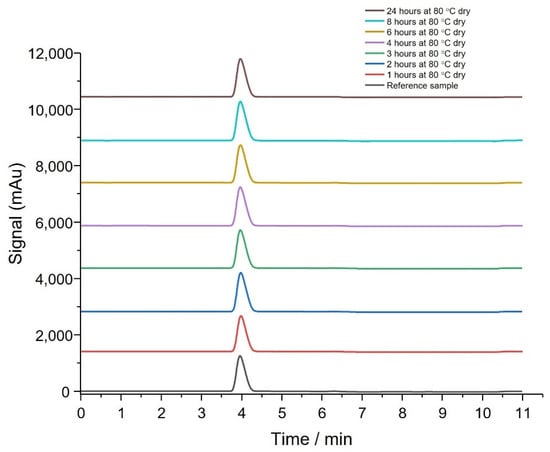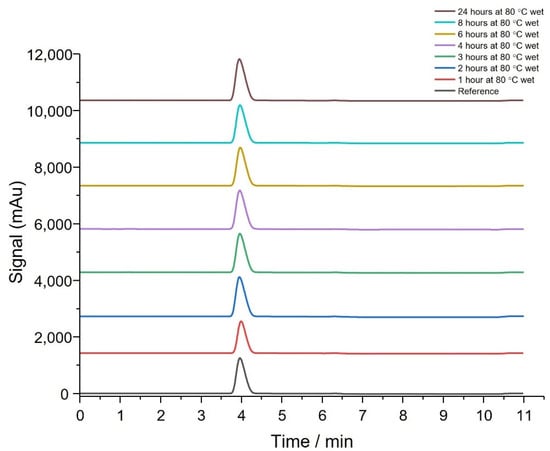 Forced degradation studies were performed according to the above method. Obtained chromatograms were compared to a fresh reference sample prepared at room temperature (Figure 2). The thymoquinone eluted at the 4 min retention time irrespective of degradation time and no impurity peaks were observed confirming that THQ is thermally stable as no degradation was evident. This confirms thermal stability of THQ at 80 °C over 24 h.