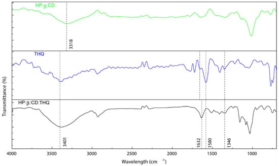 FTIR of controls HPβCD, THQ and sample THQ:HPβCD highlighting key peaks.