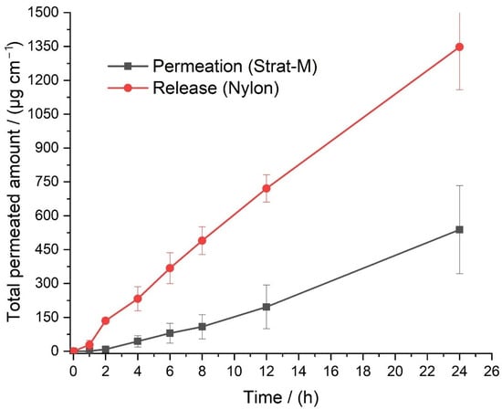 Permeation of THQ:HPβCD through Strat-M compared with release through a Nylon membrane (n = 4), error bar= standard error (SE).