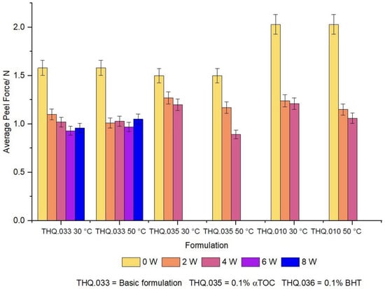 As can be seen from Figure 8, THQ.010 has the highest average peel force of 2.1 Nbut only remains adhesive for 4 weeks at both 30 °C and 50 °C. This is in contrast with THQ.035 which has a reduced average peel force of 1.7 N, but maintains adhesive properties for the whole 8 week study. These results may offer insights into additions of excipients into the wound dressing, such as α-tocapherol, and the concessions to the mechanical properties in light of enhanced physicochemical/biological activity of the medical device.