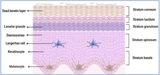 The skin may be a major barrier to the transdermal delivery of drugs. On the other hand, it may also be highly regarded for its protective and self-healing abilities []. The skin covers around 2 m2 of an average adult, preventing water loss from our body and shielding us from undesired external influences []. A schematic representation of the skin is shown in Figure 1.