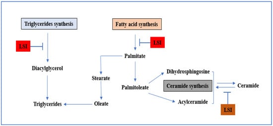 The SC lipids are mostly cholesterol, ceramides, fatty acids, and glycerol, which are the main reason behind the transdermal barrier function. A decline in the production of any of these critical lipid species compromises the barrier function, and the schematic representation of the mechanism of action of LSIs is shown in Figure 7. Considering the above consequences, it was hypothesised that transdermal drug permeability could be improved by interrupting or inhibiting skin lipid metabolism. A study was conducted using LSIs, such as 5-(tetradecyloxy)-2-furancarboxylic acid (TOFA), fluvastatin (FLU), and cholesterol sulfate (CS) for enhancing the transdermal delivery of lidocaine or caffeine and it was concluded that lipid synthesis inhibitor augments the transdermal delivery of the drug by altering both the barrier haemostasis or thermodynamic property of the skin []. Babita et al. performed a series of studies using LSIs, such as beta-chloralanine or atorvastatin, which superficially target the sphingosine (a precursor of ceramides), cholesterol cerulenin (an inhibitor of fatty acid synthase enzyme), and atorvastatin. In brief, all LSIs were used to enhance the transdermal delivery of levodopa by targeting various essential components in lipid synthesis [,,]. Gupta et al. used beta-chloroalanine (beta-CA), a selective inhibitor of serine palmitoyl transferase, in combination with ethanol to increase the transdermal flux of 5-fluorouracil across rat skin []. Li et al. employed trypsin, a proteolytic enzyme, as a biochemical enhancer to increase insulin transdermal delivery []. Li et al. used trypsin to improve penetration via hair follicular delivery and the intercellular pathway. The ATR-FTIR study suggests that trypsin distorted the SC lipid structure, disturbing skin barrier properties and enhancing its effect [].