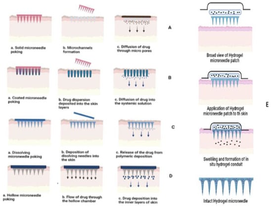 Microneedle approaches: (A) solid microneedles, (B) coated microneedles, (C) dissolving microneedles, (D) hollow microneedles, and (E) hydrogel microneedles.