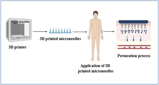Three-dimensional printing or three-dimensional printing technologies have become a versatile method in the design and production of microneedles. This emerging technology tries to address the existing deficiency of traditional methods, thereby making up an ideal process in manufacturing []. The manufacturing process includes printing by fused deposition modeling, stereolithography, digital light processing, continuous liquid interface production, and two-photon polymerisation [,]. These work by a computer-aided design module, whereby materials are added layer by layer to form a versatile dosage form. They can even form a complex structure of fewer than 0.1 microns in size. The process is rapid and can be utilised for scalability. Various researchers have shown the merits of using 3D printing technology in microneedles, and its diagrammatic representation is shown in Figure 10. Donghyeok Shin and Jinho Hyun et al. [] prepared silk fibroin microneedles using digital light processing 3D printing technology. The method was opted for because of its simple single-step preparation process and high efficiency for delivering protein, i.e., silk fibroin. Sophia N. Economidou et al. [] prepared intradermal microneedles using 3D stereolithography technology for insulin delivery. It was observed that 3D-printed microneedles penetrate the skin fast with the minimum application of force. Coated films had strong adhesion on the microneedle surface, improving durability. Md Jasim Uddin et al. [] fabricated 3D-printed microneedles for cisplatin delivery in cancer treatment. Stereolithography technology results in polymeric microneedles with an 80% penetration capability and an 80–90% release rate. The in vivo activity confirmed high anti-cancer activity and tumor regression.