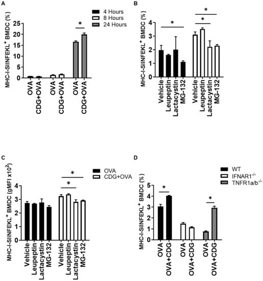 Cross-presentation of the OVA immunodominant peptide SIINFEKL in BMDC pulsed with OVA +/− CDG. (A) WT BMDC were treated with OVA +/− CDG for 4, 8 and 24 h. The frequency of cross-presenting BMDC was quantified using flow cytometry. (B) Frequency or (C) geometric mean of the fluorescence intensity (gMFI) of cross-presenting BMDC were quantified in the presence or absence of inhibitors of the cytosolic pathway (MG-132 or lactacystin) and an inhibitor of the vacuolar pathway (leupeptin). (D) Cross-presentation of BMDC from IFNAR1−/− and TNFR1a/b−/− mice was compared to WT counterparts in the presence or absence of CDG. Error bars indicate SEM. Statistical significance was calculated using a one-tailed Student’s t-test. * indicates p < 0.05. The results are representative of two to three independent experiments.