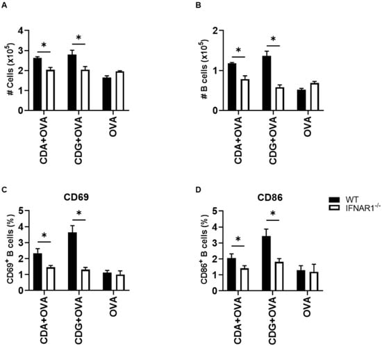 Based on our previous works and different reports, it is known that the absence of type I IFN signaling results in underdeveloped humoral immunity in adults and neonates [12,13,14]. Thus, we measured the number and activation status of B cells after immunization with OVA + CDG/CDA or OVA alone in WT and IFNAR1−/− mice. We observed a significant reduction in the total number of cells in the (draining) inguinal lymph node including the number of B cells (CD19+ cells) in IFNAR1−/− mice with respect to WT mice when immunized with CDN as adjuvants (Figure 3A,B).