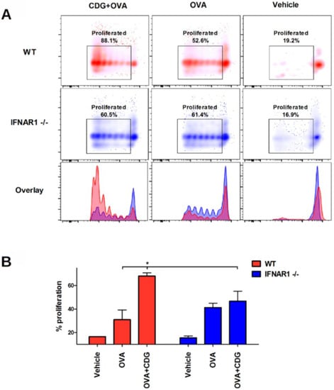 Next, we assessed whether CDG-induced cross-presentation can promote cross-priming in vivo. To this end, we performed a passive transfer of CFSE-labeled OT-I CD8+ T cells into congenic recipient mice. After 24 h we immunized the recipient mice. Then, 72 h following immunization, we isolated the spleen and LN and measured the proliferation of OT-I CD8+ T cells by flow cytometry (as CFSE dimming upon cell division) [9]. We also observed that the cross-priming capability is significantly reduced in IFNAR1−/− mice when vaccinated with CDG (Figure 4A,B).