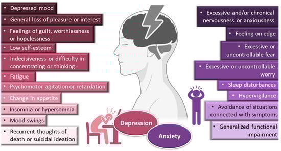 Depression frequently coexists with other mental health disorders. There is a significantly increased risk of developing a comorbid depressive disorder when someone already has an anxiety disorder [1,5,9,10,11]. Anxiety disorders are also among the most common mental disorders, having been recently estimated to globally affect more than 265 million people. They are associated with substantial functional impairment, which leads to decreased work productivity and quality of life [2,9,12]. Aside from generalized anxiety disorder, there is a wide spectrum of related disorders (such as obsessive-compulsive, posttraumatic stress, panic and social anxiety disorders), but in general symptoms can include feeling exceptionally or chronically nervous, anxious or on edge; having excessive or uncontrollable fear and worry; sleep disturbances and hypervigilance; and constant avoidance of situations that relate to the previously mentioned symptoms (Figure 1) [9,11,13,14]. Patients with anxiety disorders also have a higher prevalence of other diseases, such as cardiovascular, respiratory and gastrointestinal conditions [9,12]. Treatment of anxiety and related disorders includes psychological and pharmacological options, and the choice again depends on patient related factors, such as severity of illness, prior treatment, comorbid disorders, patient preference and motivation, etc. [9]. The first-line pharmacological options are similar to those prescribed for depressive disorders: either selective serotonin reuptake inhibitors (escitalopram, fluoxetine, fluvoxamine, paroxetine, sertraline) or serotonin and norepinephrine reuptake inhibitors (duloxetine, venlafaxine), for being generally better tolerated and safer than other treatments [9,12]. Other options include noradrenergic and specific serotonergic antidepressants, tricyclic antidepressants, monoamine oxidase inhibitors, and reversible inhibitors of monoamine oxidase A [9,11]. Benzodiazepines can also be used, but as adjunctive short-term therapy, since they can cause dependency, sedation and cognitive impairment (especially with prolonged use) [9,12]. Some anticonvulsants and atypical antipsychotics have also demonstrated efficacy, but are generally recommended as second-line, third-line, or adjunctive therapies (due to side effects). Given the variety in treatment options, again it should be a case-by-case approach, taking into consideration efficacy versus safety, the specific characteristics of the anxiety disorder, comorbid conditions and treatment duration [9].