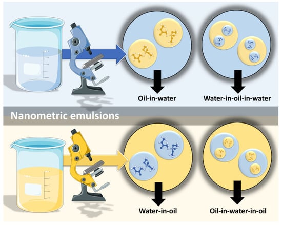 However, nanometric emulsions can surpasses all of these drawbacks. Being colloidal liquid-in-liquid dispersions, they are usually made of a water phase, an oil, a surfactant, a cosurfactant and/or a cosolvent. They can be classified according to droplet size, between nanoemulsions (20,200 nm) or microemulsions (10–100 nm), although the size range can differ between authors. Regarding what concerns the differences in their characteristics, while microemulsions have thermodynamic stability, nanoemulsions have a relatively high kinetic stability, and both have higher surface area and free energy than macroemulsions, which makes them more physically stable in comparison. They can also be classified according to the nature of their internal and external phases, as: oil-in-water (o/w) or water-in-oil (w/o), if they are biphasic (most common); or oil-in-water-in-oil or water-in-oil-in-water, if they are triphasic (Figure 3) [18,30,31].