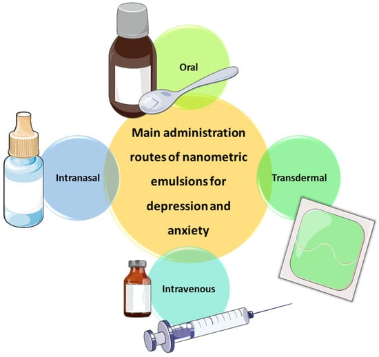 Works developing nanometric emulsions containing antidepressant and anxiolytic drugs have been administered through several different routes, including intravenous, transdermal, oral and intranasal administration (Figure 4). All these administration routes have their advantages and disadvantages, which will be highlighted in the following Section 2.1, Section 2.2 and Section 2.3.
