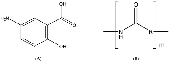 Mesalazine (MSZ), also known as mesalamine or 5-aminosalicylic acid (5-ASA) (Figure 1A), is an aminosalicylate widely used in IBD to induce remission and maintenance, especially in mild to moderate ulcerative colitis. Its mechanism of action is not fully understood, but it involves the suppression of NF-kB, protection of the epithelial barrier of T84 cells against peroxynitrites, reduction in free radicals and inhibition of leukotrienes, prostaglandins and proinflammatory cytokines [,].