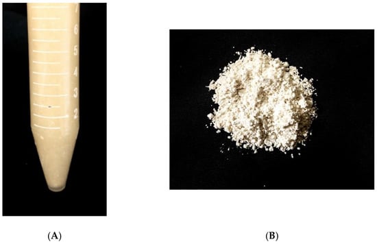 Initially, the polymer–drug ratios (1:10; 1:12, 1:15 and 1:20) were tested; however, there was precipitation due to the saturation of the drug in relation to the polymer, with no formation of nanoparticles. Therefore, the best drug–polymer ratio was 1:20 (30 mg of drug and 600 mg of zein). The formation of nanoparticles was confirmed by the presence of the Tyndall effect [], characterized by the visualization of an opalescent suspension with a milky appearance (Figure 3A).