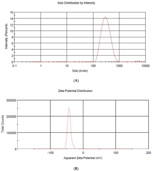 Through the dynamic light scattering method (DLS), the NP-ZN-MSZ showed a size of 266.6 ± 52 nm, and the empty nanoparticle (NP-ZN) was of a smaller size (218 ± 23 nm) due to the nonincorporation of the drug to the nanoparticles. NP-ZN-MSZ had sizes that were major determinants of the ability of particles to passively reach inflamed intestinal mucosa and achieve maximum tissue retention times due to a greater surface area as a result of greater reactivity [,]. The polydispersity index that provided information on the homogeneity of the size distribution was 0.14 ± 0.1. The NPs presented negative charges with zeta potential values of −42.4 ± 5.31 mV (Table 1; Figure 4). Values less than 0.2 for the polydispersity and above 30 mV for the zeta potential (in the module) indicated a good colloidal stability in the solution, preventing the aggregation of NPs []. These data corroborated the findings of [,] that synthesized zein nanoparticles (ZNP) to encapsulate quercetin. The encapsulation efficiency (EE%) was 45%; [] synthesized the NP-ZN using the phase separation method to encapsulate beta carotene, and obtained 55% EE.