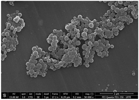 Scanning electron microscopy (SEM) was performed to determine the morphology and characteristics of the polymeric surface using the FEI field emission electron source equipment (SEM-EC), model FEG-250. Polymers are sensitive to the electron beam, so the samples were previously metallized with aluminum []. The NPs were placed in a stub wrapped with aluminum foil and metallized with gold. The equipment was configured for 15 KV and spot 3.