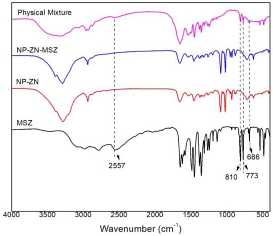 In the infrared spectrum of mesalazine (MSZ), the presence of bands that identify its functional groups was observed: 3471 cm−1 (N-H stretching), 2557 cm−1 (NH2 deformation), 1620–1590 cm−1 (N-H primary deformation and C-N stretch), 1246 cm−1 (C-N stretch), 3085 and 2978 cm−1 (C-H aromatic stretch), 2784 cm−1 (carboxylic acid OH stretch), 1647 cm−1 (C=O stretch of carboxylic acid), 1192 cm−1 (C-O stretch phenol), 810, 773 and 686 cm−1 (out-of-plane deformation of C-H in aromatic rings). These data corroborated the literature [,,,,]. NP-ZN bands were observed at 3381 cm−1 (N-H stretch), 2935 cm−1 (C-H stretch), 1660 cm−1 (C=O stretch), 1530 cm−1 (N-H stretch) and 1259 (C-N stretch) [,,,]. In the physical mixture, an N-H deformation band was observed at 2557 cm−1, indicative of the amino group of mesalazine [], and bands at 810, 773 and 686 cm−1, referring to out-of-plane C-H strains also belonging to mesalazine []; these bands appeared at low intensity due to the low drug:polymer ratio (1:20), and were not identified in the NP-ZN-MSZ, which showed no significant difference from the NP-ZN, indicating drug encapsulation by the nucleus prolamin without structural changes and impurities (Figure 6).
