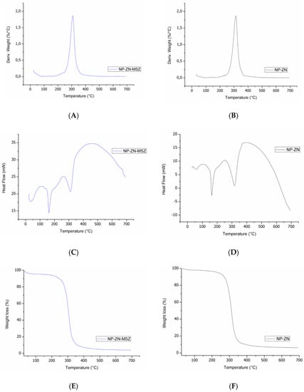 Thermogram of NP-ZN-MSZ (A,C,E) and NP-ZN (B,D,F).