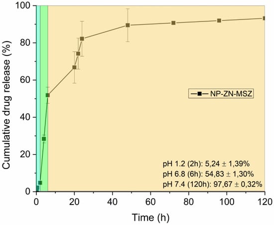 In vitro release studies were performed at pH 1.2, pH 6.8 and pH 7.4 at 37 °C to simulate physiological conditions when administered orally (Figure 8). At pH 1.2, in the first 2 h of the test, there was a slight release of MSZ from the nanoparticles (5.24 ± 1.39%), which suggested gastroresistance. The change to pH 6.8 during 4 h increased the release profile to 54.83 ± 1.30%, remaining at pH 7.4, where a sustained release of 97.67 ± 0.32% was observed.