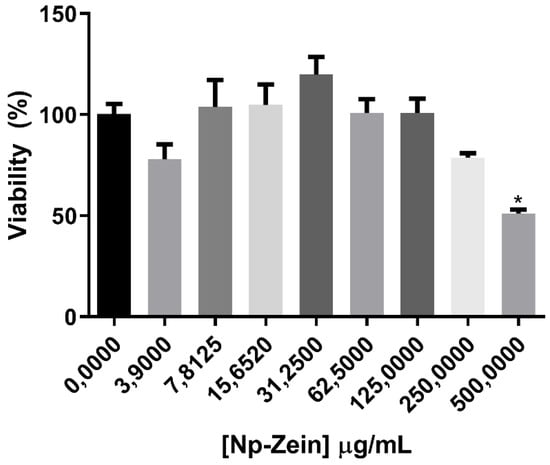 Figure 9 shows the in vitro cytotoxicity study of the NP-ZN using the previously cultured CT26 (murine colon adenoma) cell line. Nanoparticles at different concentrations were added to the cell suspension and left for 72 h at 37 °C. Cell viability was measured using the MTT assay, where the nanoparticles did not show a basal cytotoxicity up to a concentration of 500 μg/mL; the usual concentration of zein used for the synthesis of NPs is 296 µg/mL, so we verified the biocompatibility of NPs.
