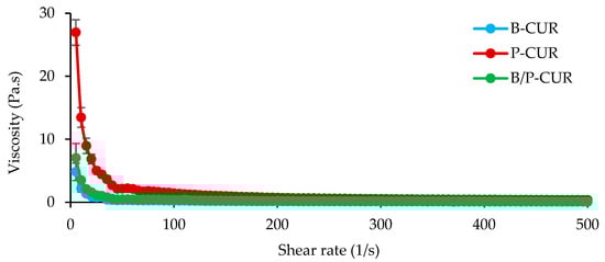 In Figure 2 (top panel), the viscosity profiles of B-CUR, P-CUR, and B/P-CUR hydrogels are reported.