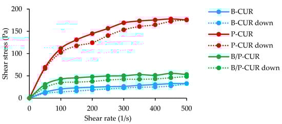 Viscosity profiles (top panel) and flow curves (bottom panel) of B-CUR, P-CUR, and B/P-CUR hydrogels measured up to 500 s−1 at 32 °C (mean values ± s.d.; n = 3).