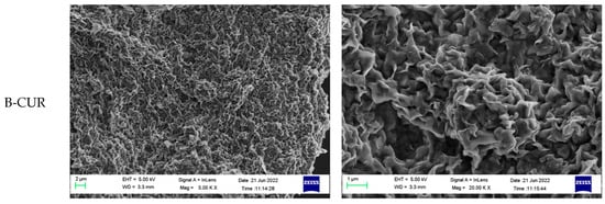 In Figure 3, the SEM microphotographs of freeze-dried B-CUR, P-CUR, and B/P-CUR hydrogels are presented. The morphologies are highly affected by the presence of different clays. B-CUR hydrogels were characterized by porous structure that resulted from the sublimation of water during freeze drying, with a flake-like structure. On the other hand, P-CUR hydrogel showed a fiber-like structure with many individual needle-like crystals of varying dimensions, typical of palygorskite. Finally, B/P hydrogel exhibited the typical features of both bentonite and palygorskite.