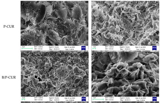 SEM microphotographs of freeze-dried B-CUR (top panel), P-CUR (middle panel), and B/P-CUR (bottom panel) hydrogels.