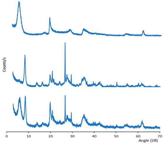 XRPD diffraction patterns of B-CUR (top panel), P-CUR (middle panel), and B/P-CUR (bottom panel) hydrogels.