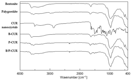 FTIR spectra of the pure components (bentonite, palygorskite, and curcumin nanocrystals) and hydrogels (B-CUR, P-CUR, and B/P-CUR).