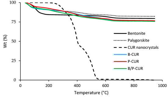 The TGA thermogram of pure bentonite revealed an initial slight weight loss, followed by a dehydroxylation step in the range temperature between 600 °C and 700 °C [24]. Pristine palygorskite exhibited four stages of mass loss: Firstly, a weight loss of 8% occurs at 95 °C, corresponding to surface water loss. The second weight loss of 3% at 220 °C is related to loss of zeolitic water located in the channels. The third thermal event corresponds to the water linked to the octahedral ions (weight loss of 4%) at 440 °C and, finally, a mass loss of 1.89% is due to the dehydroxylation of the clay at 640 °C. DSC thermograms of both bentonite and palygorskite confirmed their stability in the temperature range evaluated. Moreover, endothermic degradation peaks of CUR nanocrystals were measured over 400 °C in the studied inorganic gels, confirming the stable effect of the formulations, as curcumin degradation has been reported to occur at lower temperature [27].