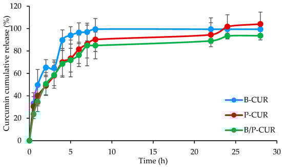 Figure 7 reports the release profiles of curcumin from B-CUR, P-CUR, and B/P-CUR hydrogels.