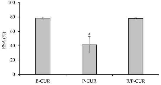Radical scavenging activity (RSA%) of curcumin released from B-CUR, P-CUR, and B/P-CUR hydrogels (mean values ± s.d.; n = 3). * indicates significant differences (p < 0.05).