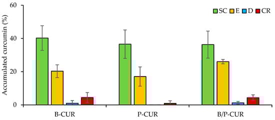Figure 9 reports curcumin skin penetration into stratum corneum (SC), epidermis (E), dermis (D) and receptor chamber (CR) from B-CUR, P-CUR, and B/P-CUR hydrogels. The skin permeation studies were carried out using 1:1 (v/v) PBS/ethanol mixture as receptor medium, which is considered in the literature to be a suitable release medium [33,34,35], wherein curcumin is soluble.
