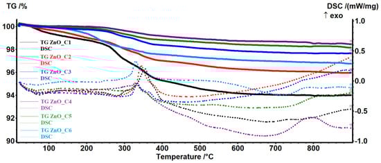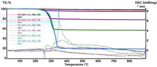 As the reactants include only the zinc acetate and the corresponding alcohol, the expected products are ZnO nanoparticles and eventually Zn(OH)2 and unreacted zinc acetate, together with polymeric intermediate species like Zn5(OH)8(CH3OO)2 or Zn5(CO3)2(OH)6 [,,,]. For the samples obtained in the C1-C6 alcohols, the thermal analysis results are presented in Figure 1. Results for individual thermal analyses made for samples obtained in primary alcohols are given in Supplementary Materials, Figures S1–S6, and the principal data (mass loss and effect temperatures) are listed in Table S1.