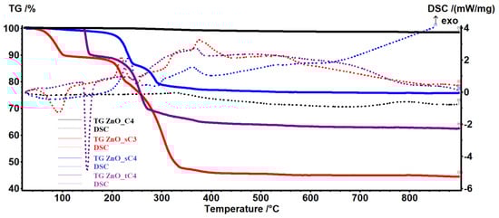 In Figure 2 are presented the results obtained for the syntheses in secondary and tertiary alcohols. The lower residual mass indicates that the ZnO in this case is highly impure. The residual mass varies from 75.75% for the sample ZnO_sC4 to 44.32% for the sample ZnO_sC3. For the samples ZnO_sC3 and ZnO_tC4, the endothermic peaks from the DSC curve between 90–200 °C indicates the existence of a decomposition step, while for ZnO_sC4, the first mass loss occurs over 200 °C and is represented by an oxidation process. These results, coupled with the XRD analysis, led us to discard from the study the samples obtained in secondary and tertiary alcohols.
