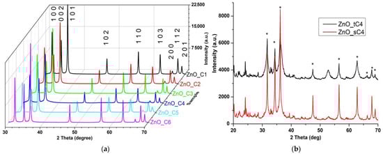 The XRD patterns for the nanopowders obtained in: (a) primary alcohols ZnO_C1 in methanol; ZnO_C2 in ethanol; ZnO_C3 in 1-propanol; ZnO_C4 in 1-butanol; ZnO_C5 in 1-pentanol; ZnO_C6 in 1-hexanol; (b) nanopowders in secondary and tertiary alcohols ZnO_sC4 in 2-butanol and ZnO_tC4 in tert-butanol (* denotes ZnO peaks).