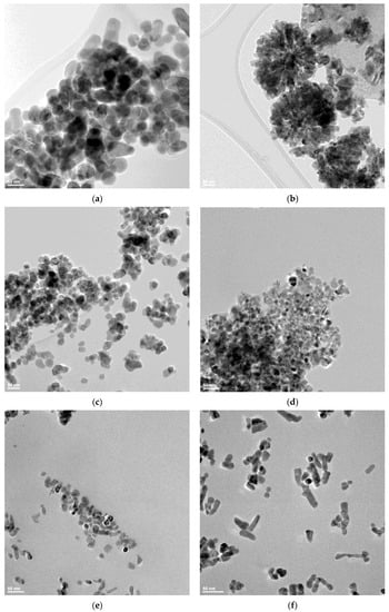 The transmission electron micrographs for: (a) ZnO_C1; (b) ZnO_C2; (c) ZnO_C3; (d) ZnO_C4; (e) ZnO_C5; (f) ZnO_C6 samples.