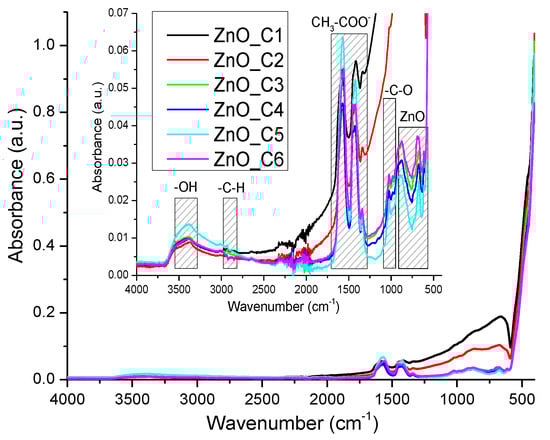 The FTIR spectra for the nanopowders obtained in primary alcohols: ZnO_C1 in methanol; ZnO_C2 in ethanol; ZnO_C3 in 1-propanol; ZnO_C4 in 1-butanol; ZnO_C5 in 1-pentanol; ZnO_C6 in 1-hexanol. Inset presents the detailed spectra between 500–4000 cm−1.