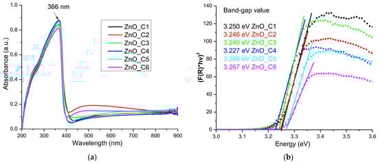 The ZnO nanopowders are white, and therefore present little absorption in the visible spectrum, but they exhibit a strong absorption band in the UV domain, with the peak at 366 nm (Figure 7a). This strong absorption under 400 nm is the reason why ZnO nanoparticles are used as key component of sunscreen cosmetics [,,], but also in the textile industry [,,] or as a protective coating []. This absorption band is related to the electron jump from valence band to conduction band and can be used to estimate the band-gap values for ZnO nanopowders.