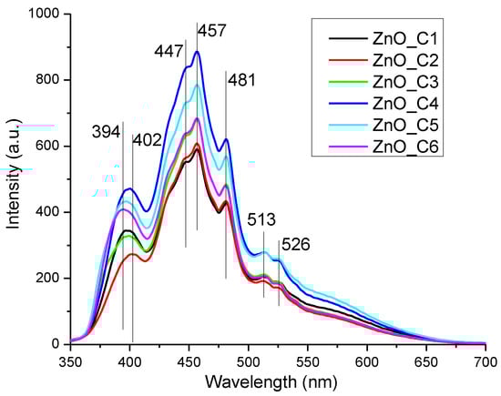 The green emission from 2.42 eV (513 nm) and further is generated mainly by VO and VO+ defects [,,,,]. The strongest emission intensity is observed for the ZnO_C4 sample, indicating a higher density of surface defects.