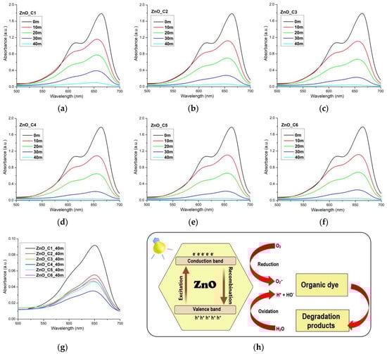 Photocatalytic activity against methylene blue (MB) for: (a) ZnO_C1; (b) ZnO_C2; (c) ZnO_C3; (d) ZnO_C4; (e) ZnO_C5; (f) ZnO_C6; (g) detail for all samples after 40 min irradiation; (h) the proposed mechanism for photo-degradation of the dye.