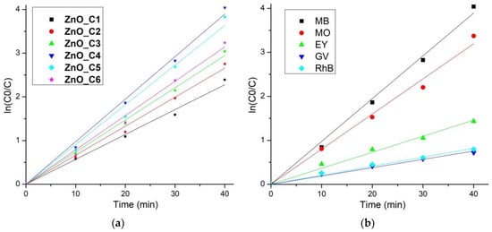 Determination of kapp from the slope of ln(C0/C) vs. time for: (a) ZnO_C1 to ZnO-C6 samples against MB solution; (b) ZnO_C4 sample against MB, MO, EY, GV and RhB solutions.