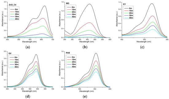 Photocatalytic activity of ZnO_C4 sample against methylene blue (a); methyl orange (b); eosin Y (c); gentian violet (d); and rhodamine B (e).