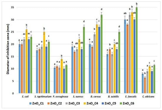 Assessment of antimicrobial activity was performed using eight reference microorganisms by American Type Culture Collection (ATCC, Manassas, VA, USA): one fungal strain, Candida albicans (C. albicans) ATCC 10231; three Gram-negative bacterial strains of Escherichia coli (E. coli) ATCC 25922; Salmonella enterica serovar Typhimurium (S. typhimurium) ATCC 14028; Pseudomonas aeruginosa (P. aeruginosa) ATCC 27853; four Gram-positive bacterial strains of Staphylococcus aureus (S. aureus) ATCC 25923; Bacillus cereus (B. cereus) ATCC 19659; Bacillus subtilis (B. subtilis) ATCC 6633; and Enterococcus faecalis (E. faecalis) ATCC 29212. In order to determine the antimicrobial activity of ZnO nanoparticles, we employed an adapted diffusion assay, presented in [,], respecting the general rules exposed in the CLSI 2020.