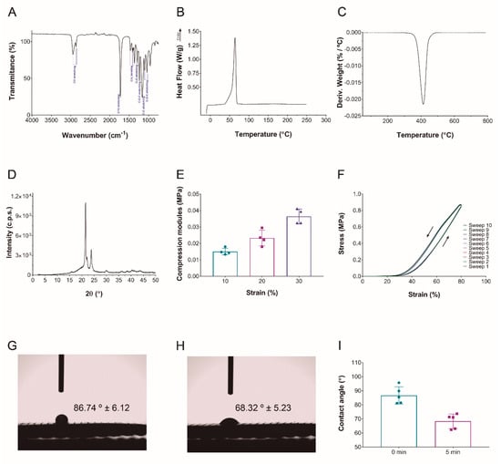 Hybrid PCL scaffold characterization. (A) FTIR spectrum. (B) DSC curve. (C) DTGA curve. (D) XRD pattern. (E) Compression module values calculated at different strain values. (F) Stress-strain curves of a ten compression-decompression cycle. (G) Water contact angle at initial time. (H) Water contact angle at 5 min. (I) Mean value and standard deviation of contact angle values at 0 and 5 min.