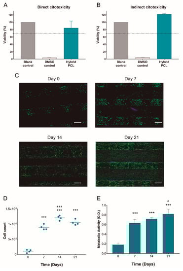 Considering that biomedical materials must present an adequate biocompatibility, in vitro cytotoxicity studies compliant with the ISO 10993-5:2009 guidelines for biomedical devices were performed. For direct cytotoxicity assays, L-929 fibroblasts were cultured in direct contact with the hybrid PCL scaffolds for 48 h (Figure 3A). In the case of the indirect cytotoxicity test, the cells were cultured for 48 h with extraction medium—obtained from incubating hybrid PCL scaffolds in complete culture medium for 24 h (Figure 3B). The variability observed between viability values in direct and indirect cytotoxicity tests was due to the inherent experimental differences between both assays, as also observed in other works [,]. Indeed, a recent publication highlighted that the differences between both assays makes the assessment by both methods necessary []. In both tests, the cells cultured in hybrid PCL scaffolds scored viability values above the 70% of the blank controls—which were 2D cultured in plates with regular complete culture medium. Therefore, hybrid PCL scaffolds can be considered as non-cytotoxic biomaterials according to the ISO 10993-5:2009 guidelines.