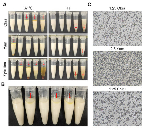 Stability study and morphology. (A) The 21-day storage stability. From left to right: 1.25, 2.5, 5, 10, and 20 mg/mL. Emulsions were stored at 37 °C and at room temperature for 21 days. (B) Forced thermal stability study. From left to right: 1.25 and 2.5 mg/mL okra polysaccharide, 2.5, 5, and 10 mg/mL yam polysaccharide, and 1.25 mg/mL spirulina polysaccharide emulsions. Here, the stratification of the emulsions at 85 °C over 2 h is shown. (C) An optical microscope was employed to observe the morphologies of the emulsions of 1.25 mg/mL okra polysaccharide, 2.5 mg/mL yam polysaccharide, and 1.25 mg/mL spirulina polysaccharide at room temperature.