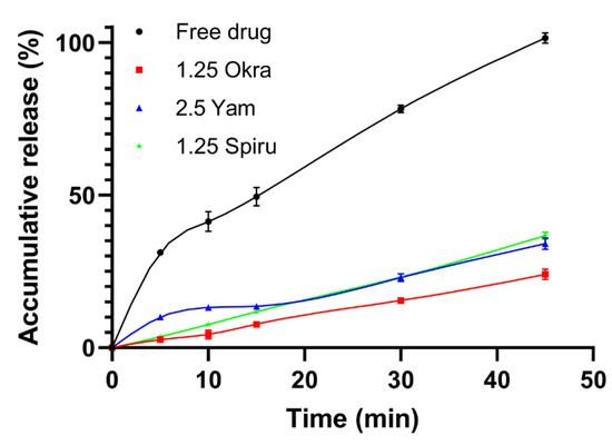 At present, there has been increasing interest in the application of polysaccharides as polymeric biomaterials in drug delivery, since they are featured as biodegradable and biocompatible materials with controllable rigidity and functionality [6]. Additionally, these materials made from natural edible constituents show good safety profiles, and some dietary polysaccharides are even beneficial to patients in terms of general health and, thus, are widely consumed as nutraceutical supplements [7]. Moreover, some dietary polysaccharides have exhibited excellent emulsifying properties due to their higher chemical and colloidal stability; thus, the dietary-polysaccharide-modified emulsions have been introduced to provide appropriate stability of systems against the harsh environment in the GIT [8]. Some specific dietary polysaccharides show bio-adhesive properties, which allow for adhesion to the intestinal epithelial membrane and prolong drugs’ residence times in the GIT, thus promoting the drug absorption [9]. As functional food ingredients, okra fruit, yam, and spirulina have been noticed due to their great health benefits owing to their various biological activities, such as their antioxidant [10], anti-fatigue [11], immunomodulatory [12], anti-hyperglycemic [13], anti-hyperlipidemic, and anti-diabetic effects [14]. Indeed, okra, yam, and spirulina are all rich in bioactive polysaccharides, and they show great potential for being further explored as functional food ingredients for industrial applications in nutraceuticals and pharmaceutics [15].