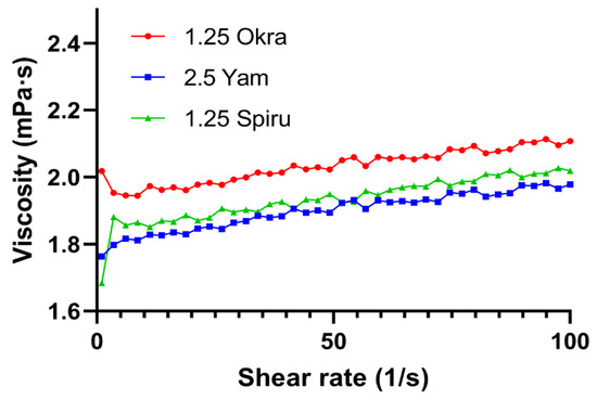 A flow curve is a graphical representation of how a flowing material behaves as the shear rate increases or decreases. The shape of the flow curve can distinguish the type of fluid. As shown in Figure 3, the viscosities of the three polysaccharide-modified emulsions did not increase or decrease with the increase in the shear rate from 0.1 to 100 s−1, which was consistent with the characteristics of a Newtonian fluid. This result reflected the low viscosity of the emulsions, which could improve the mouthfeel during oral administration, reduce the adhesion to the esophageal mucosa, and be friendly to patients with dysphagia or children and the elderly.