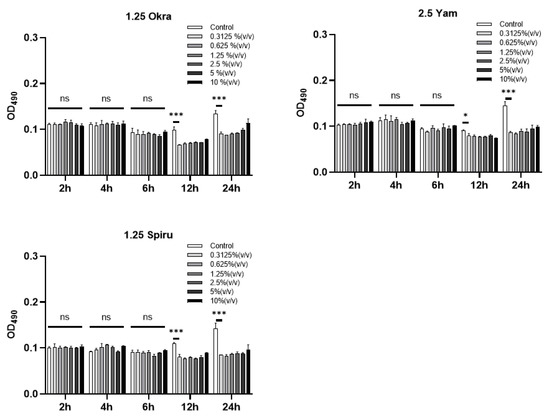 MTT assays of the three emulsions. Intestinal Caco-2 cells were cultured and six groups were set up: negative control and 10% (v/v), 5% (v/v), 2.5% (v/v), 1.25% (v/v), 0.625% (v/v), and 0.3125% (v/v) W1/O/W2 emulsions. The absorbance was read at OD = 490 nm. * p < 0.05; *** p < 0.001; ns, no significance.