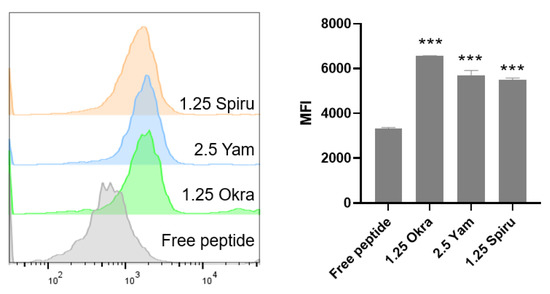 Finally, we evaluated the effects of okra, yam, and spirulina polysaccharides on the two major immune cells, dendritic cells and macrophages. More specifically, we investigated whether these polysaccharides could promote dendritic cell maturation and enhance cytokine expression in macrophages. The results indicated that okra and spirulina polysaccharides significantly increased the expression of CD80, CD86, and CD40 on the surface of BMDCs, indicating that these polysaccharides promoted dendritic cell maturation, which is conducive for antigen presentation and activation of naive T cells [39]. In addition, okra and yam polysaccharides also showed significant stimulation in RAW 264.7 cells to express the pro-inflammatory cytokines IL-6 and TNF-α. Therefore, this study demonstrated that these dietary polysaccharides showed the dual functions of forming promising carrier systems and being potential immune modulators. Additionally, it indicated that these dietary polysaccharides could activate natural immunity and might have a synergistic anti-tumor effect together with PD-L1 blocking peptides for immunotherapy.